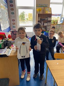 We completed an experiment to show how penguins stay dry We coloured in a paper penguin with a white wax crayon . Then