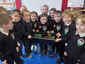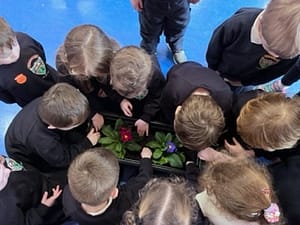 The children picked up rubbish from the school grounds and then each class planted flowers for their classroom.