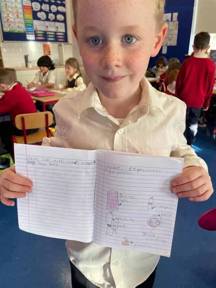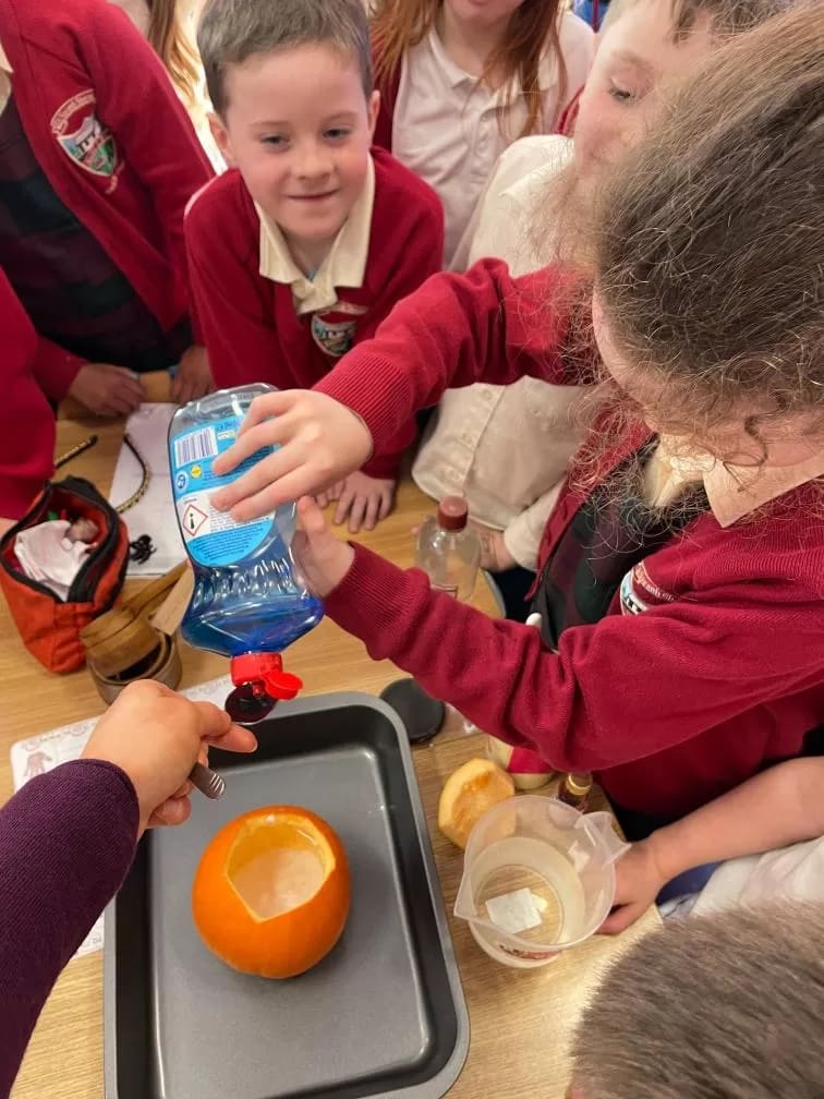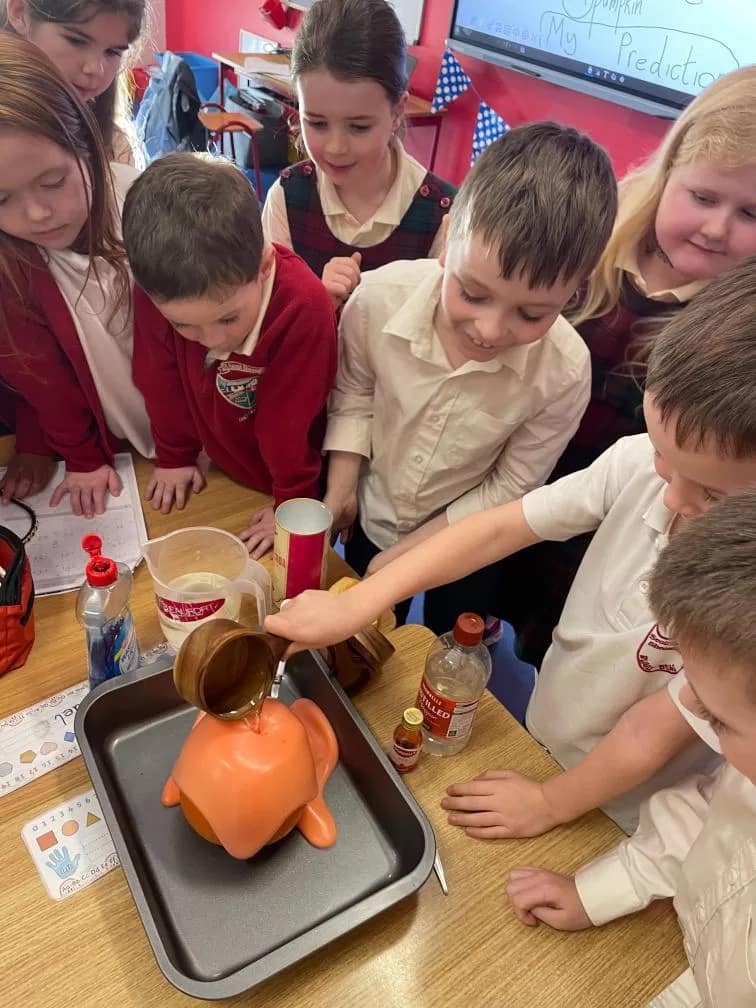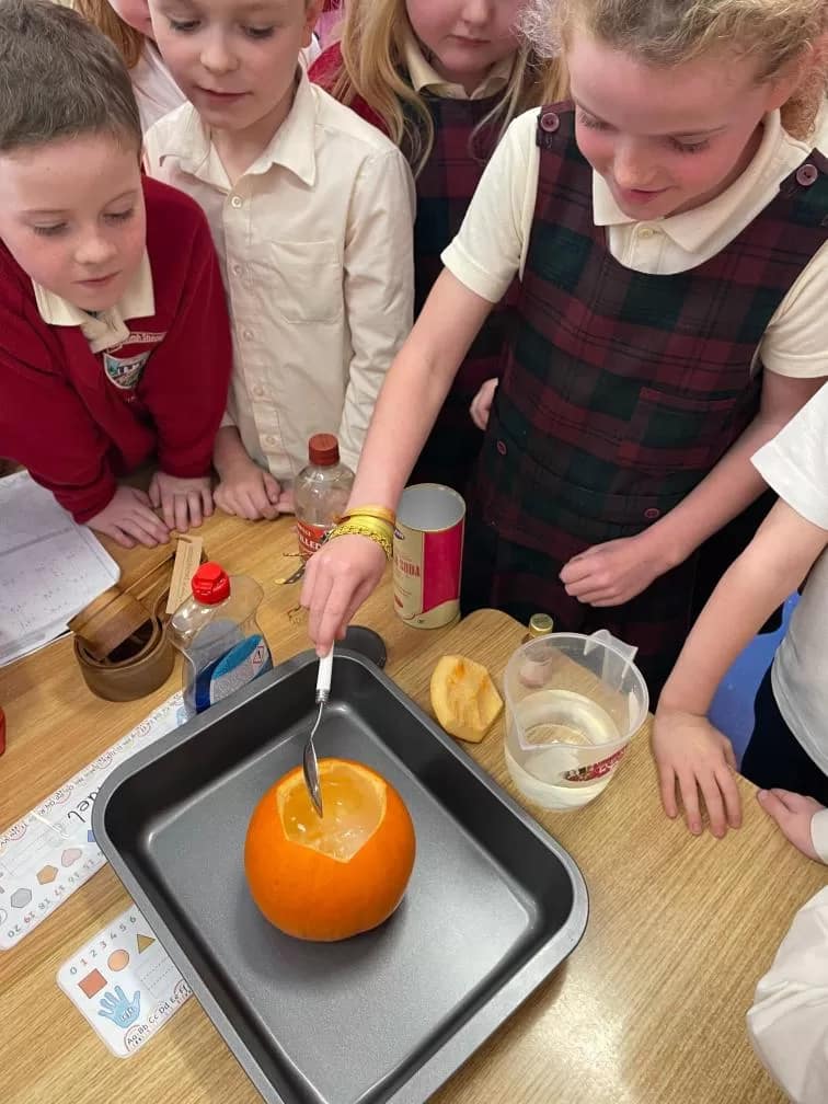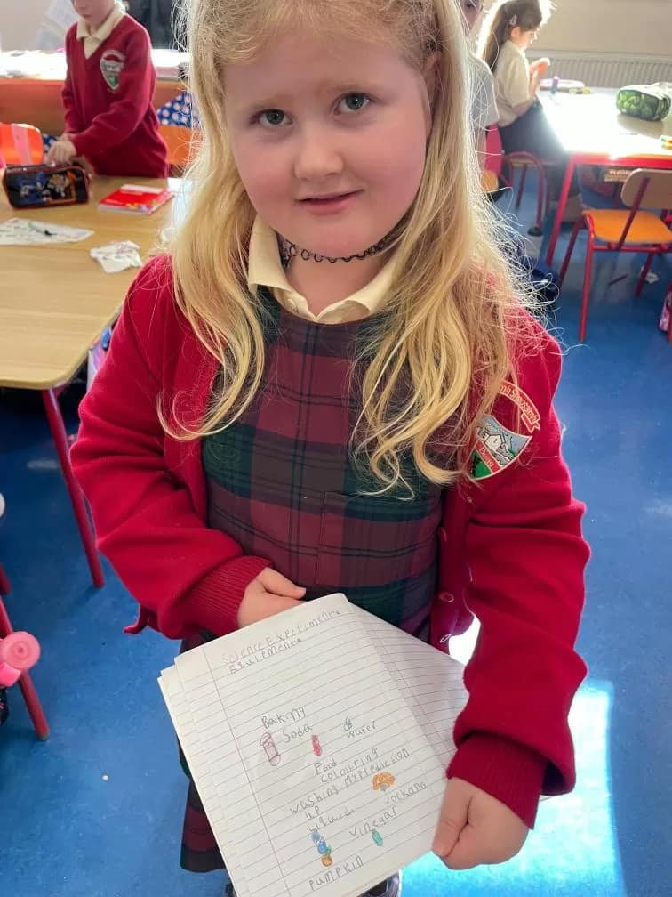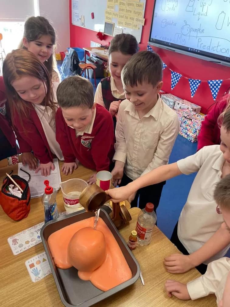 Rang 1 had great fun working as scientists this week. We made a pumpkin volcano by combining water, baking soda, vinegar, food colouring and washing up liquid inside a pumpkin. This resulted in a pumpkin eruption! We learned that the “lava” formed when the acid (the vinegar) and the baking soda (the base) react together to form carbon dioxide. We loved demonstrating our experiment to 2nd class too!