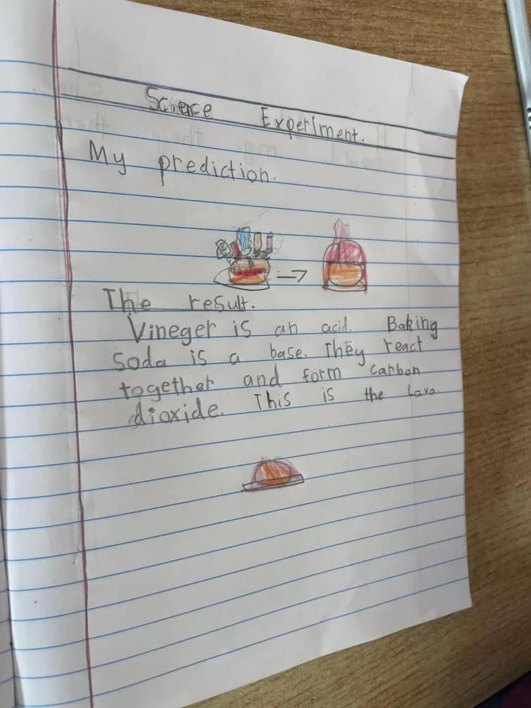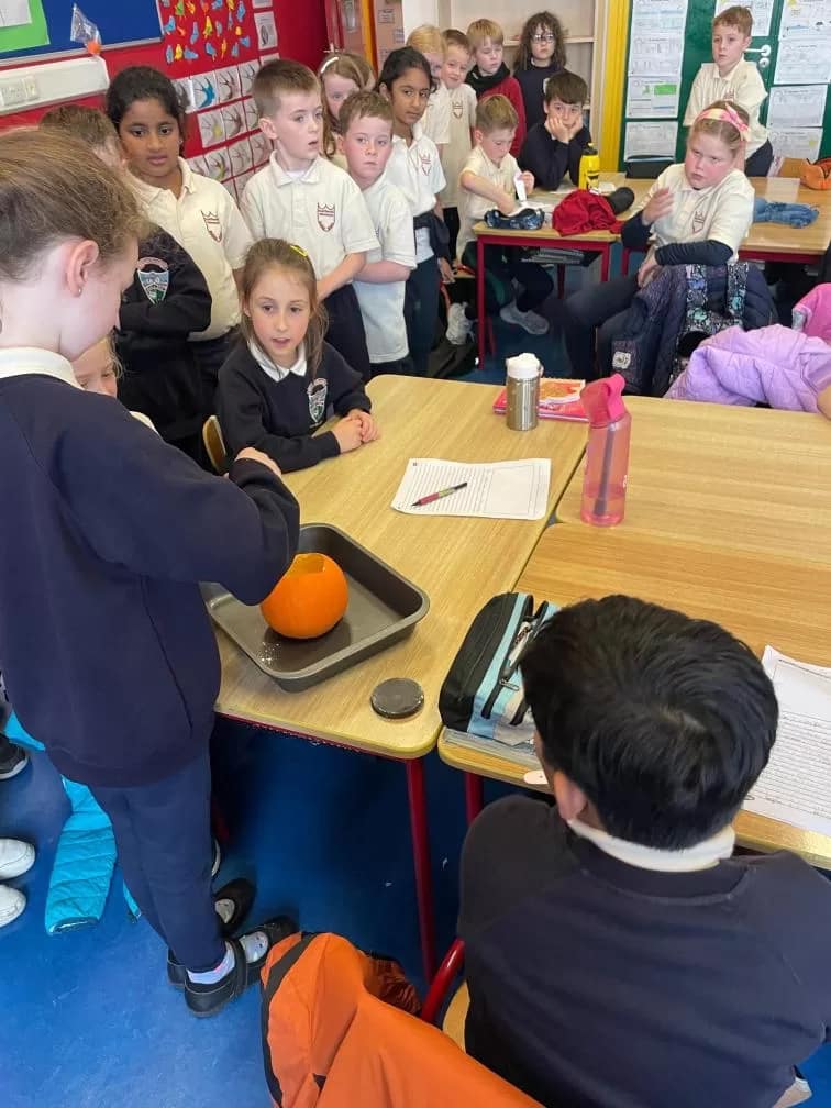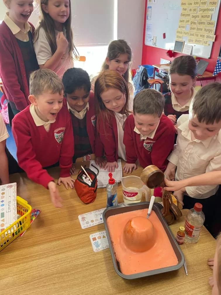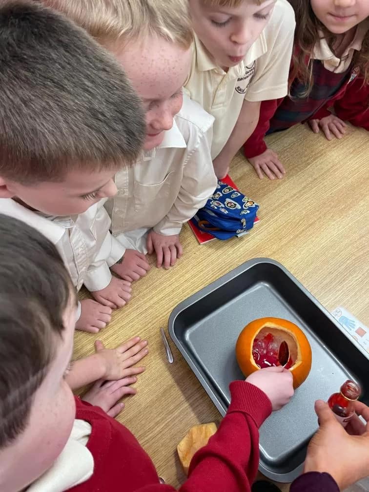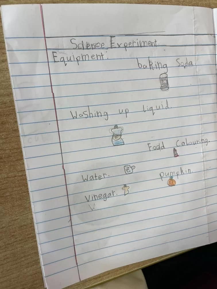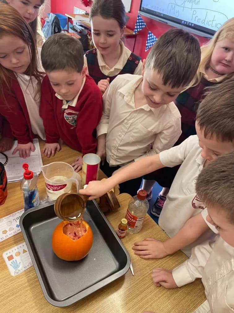 Rang 1 had great fun working as scientists this week. We made a pumpkin volcano by combining water, baking soda, vinegar, food colouring and washing up liquid inside a pumpkin. This resulted in a pumpkin eruption! We learned that the “lava” formed when the acid (the vinegar) and the baking soda (the base) react together to form carbon dioxide. We loved demonstrating our experiment to 2nd class too!